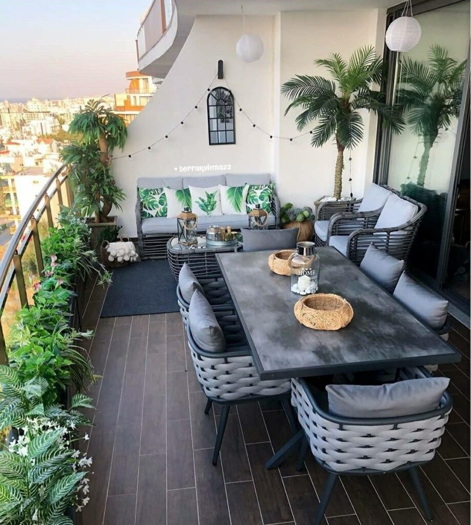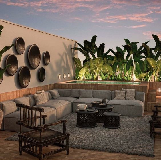 - Terrazas con estilo tropical: Se caracteriza por plantas de gran follaje, macetas amplias y materiales naturales como madera o fibras. La combinación genera un ambiente fresco y relajado, perfecto para quienes buscan una sensación de escape en casa.