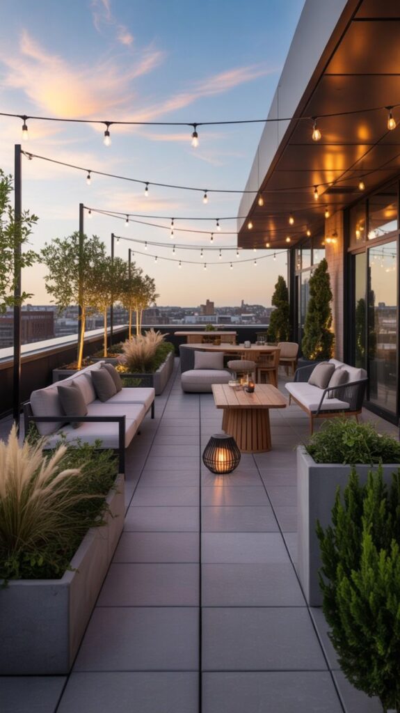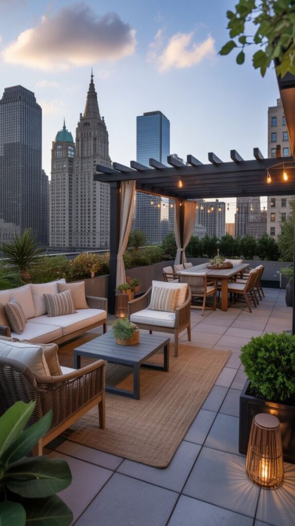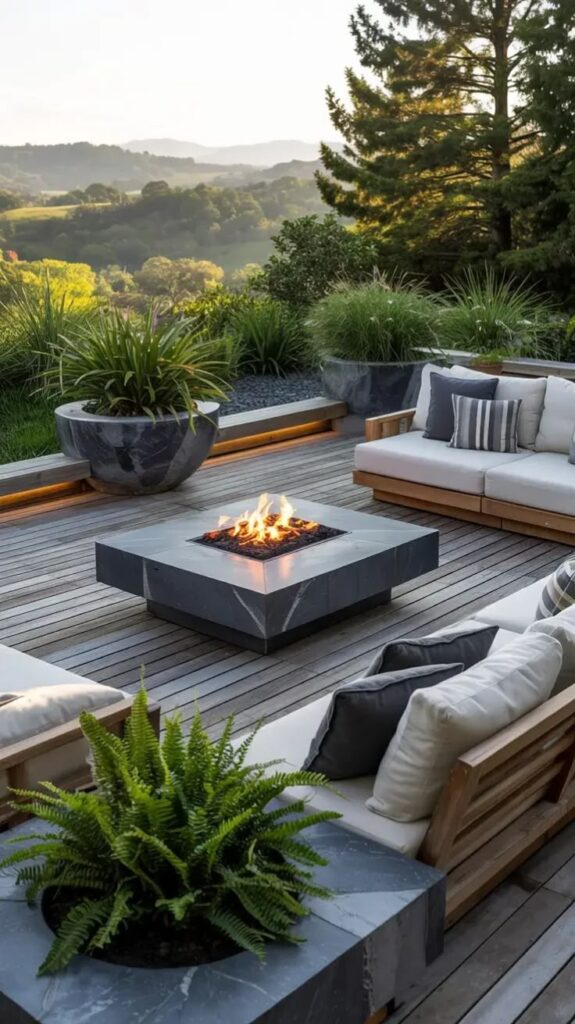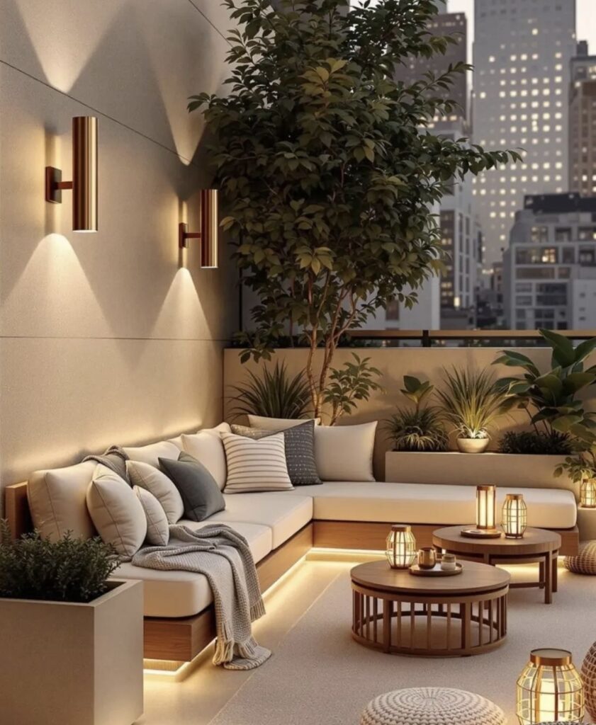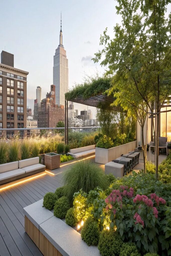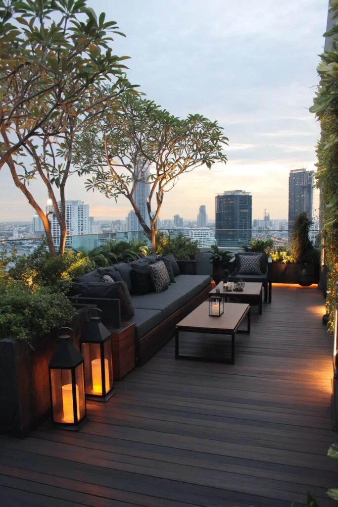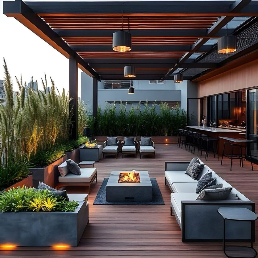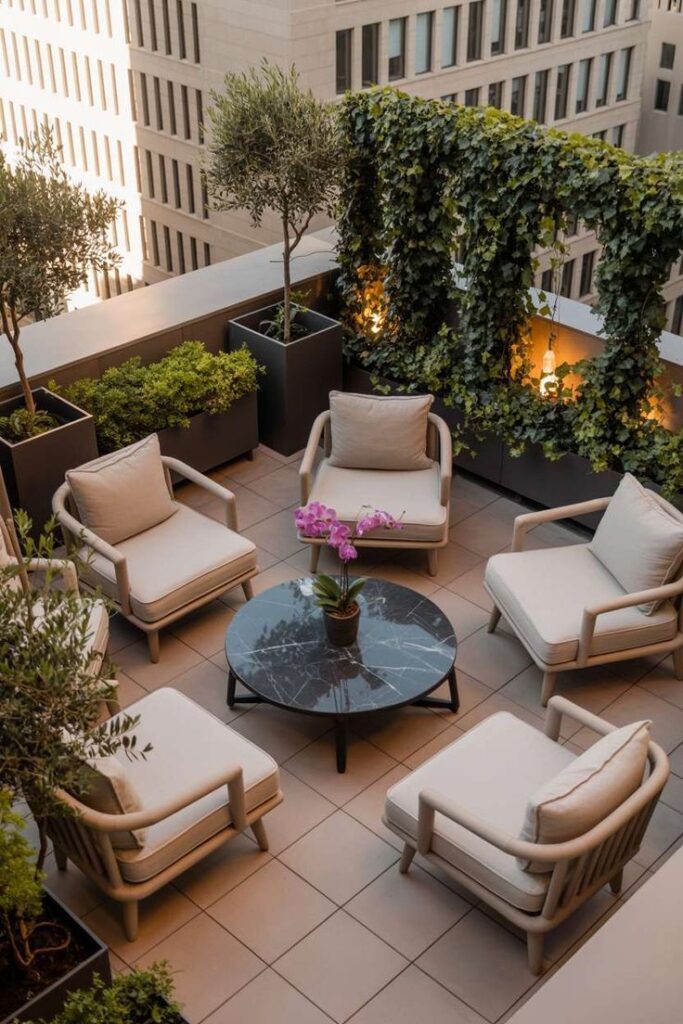 - Terrazas minimalistas con vegetación estructurada: En este diseño predominan líneas limpias y pocas especies cuidadosamente seleccionadas. Las plantas se ubican en macetas geométricas o jardineras lineales, logrando equilibrio visual sin sobrecargar el espacio.
