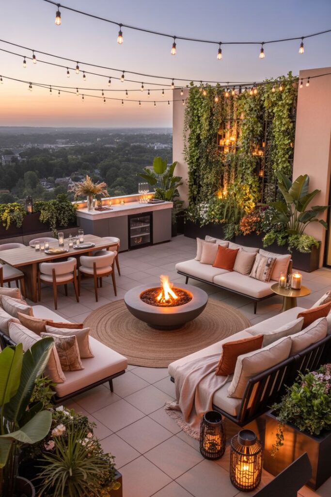 - Terrazas con jardín vertical moderno: Este diseño aprovecha muros o paneles estructurados para incorporar vegetación en altura. Es ideal para terrazas pequeñas, ya que maximiza el espacio disponible y crea un punto focal verde sin ocupar demasiada superficie.