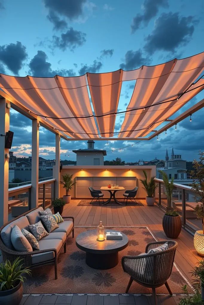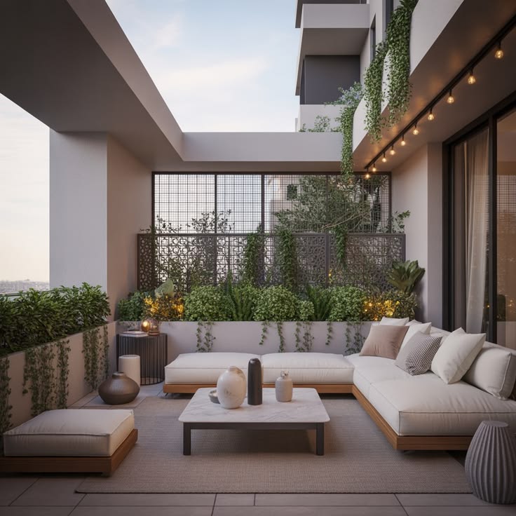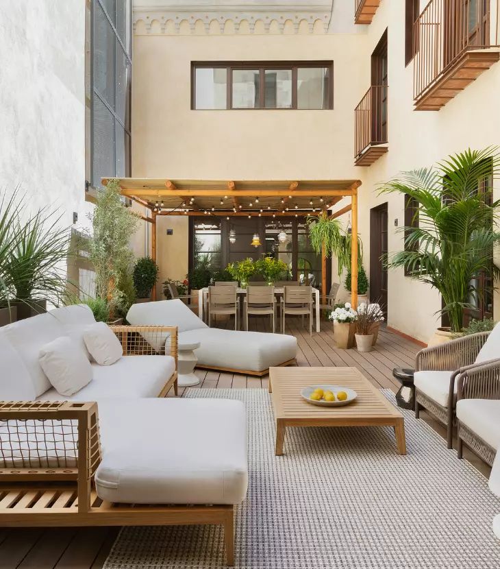 • Terraza con sala exterior climatizada: Un sofá modular bajo una pérgola, acompañado de calefactor exterior, permite disfrutar reuniones incluso en días frescos. La incorporación de plantas y lámparas suaves aporta armonía visual sin recargar el entorno.